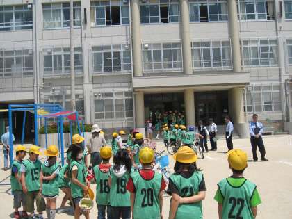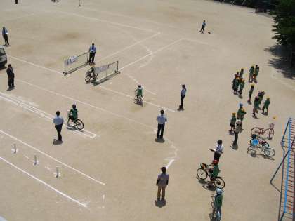 まばゆい初夏の好天気のもと,本校4年生が「自転車運転免許テスト」にチャレンジしました。テストは実技と筆記。合格すれば自転車運転免許証が中京警察署からいただけます。(詳細は,4年生のHPでご覧下さい。)