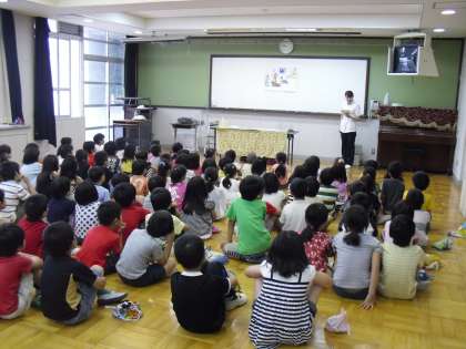 楽しいそうに紙芝居で歯みがきの大切やむし歯についての話を聞き、正しい磨き方を学習すると、みんなシャカシャカと音を立てながら一生懸命に歯を磨いていました。