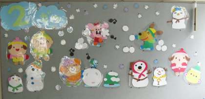 雪のちらつく寒い日になりました。給食室の今月の掲示は,雪合戦を楽しむ動物たちの様子が楽しく作られています。