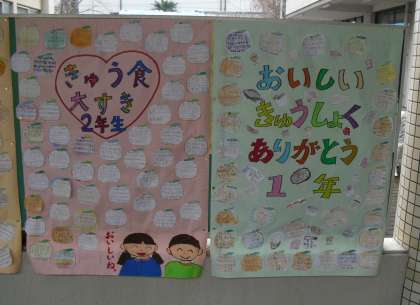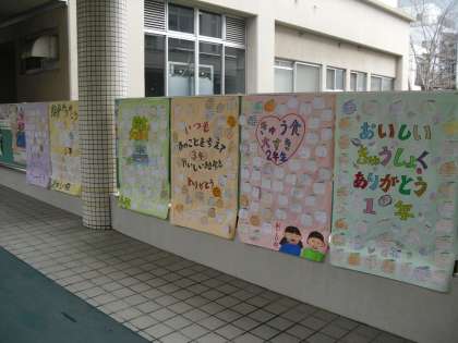 また,先週は,給食週間でした。一人一人が感謝の気持ちを伝えるカードを書き,各学年で1枚の掲示物を作りました。給食室前の掲示板に,貼ってあります。