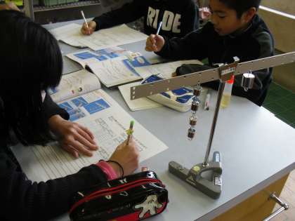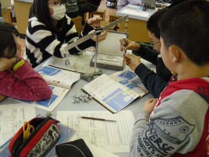 実験用てこを使って,つり合う時にはどのようなきまりがあるのか,調べました。