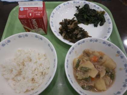 麦ごはん・牛乳・豚肉と野菜の煮つけ・ほうれん草のおかか煮・こんぶ煮 子どもたちと一緒に給食を食べていると・・・「こんぶ煮おいしいなあ」という子や,