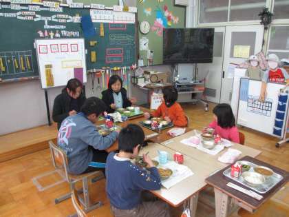 先日,給食週間の取組で,給食調理員さんがは組で一緒に給食を食べてくださいました。毎日,朝のスピーチを聞いていただいていますが,ゆっくり話せる機会はあまりないので,子ども達は楽しみにしていました。