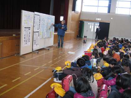 写真中:地域の防災について(朱二自治連合会長の北川様による講話)