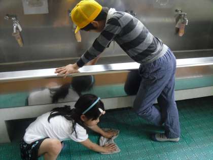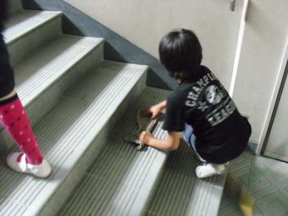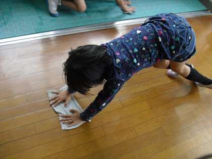遊び時間が終わって掃除です。3年生の子どもは,雑巾を使って床を磨いています。何度もこするときれいになるのが目に見えてきます。