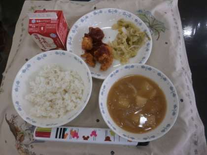 麦ごはん・牛乳・チキンカツ(ソースつき)・ソテー・みそ汁