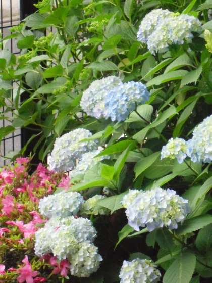 体育館の周りに植えてあるアジサイの花がきれいに咲きだしました。一雨ごとに花の色が鮮やかになってきます。