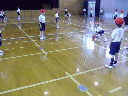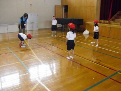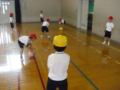 1年生は,体育館でボールを使った運動をしました。グループで順番を決めて,相手がとりやすいようにボールを転がします。だんだん上手になり,優しいボールを相手に転がすことができていました。