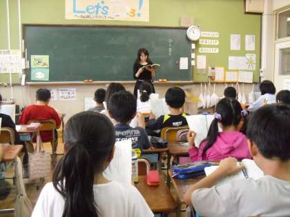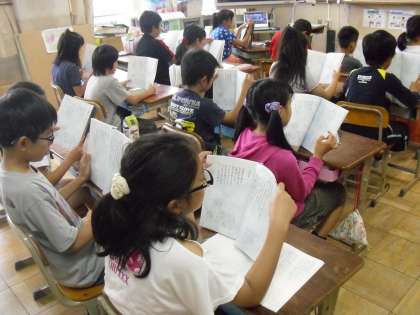 5年生の教室では,国語の時間に枕草子や竹取物語などを声に出して読み,そのリズムや言葉を楽しむ学習をしています。