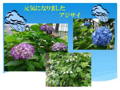 昨日からの雨で,連日の暑さで元気をなくしていたアジサイがすっかり元気を取り戻しました。一雨ごとに鮮やかさが増しそうです。