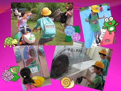 今日は,科学センター学習でした。雨も降らず暑すぎず,ちょうどいい天候の中,子ども達は,科学センターの方々が用意してくださった手作りの大型遊具でいっぱい遊ぶことができました。引っ張って動く亀の乗り物は,子ども達の力でも動くように工夫してくださっていたので,子ども達は,引っ張る役も乗る役も,どちらも楽しんでいました。常設の展示物を見たり,触ったり,体感したりするのも楽しかったようです。