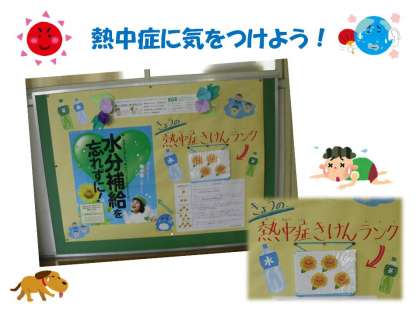 保健室前の掲示板。「きょうの熱中症きけんランク」はひまわり4つです。子どもたちは元気ですが,こまめに水分をとり熱中症にならないようにと,指導しています。