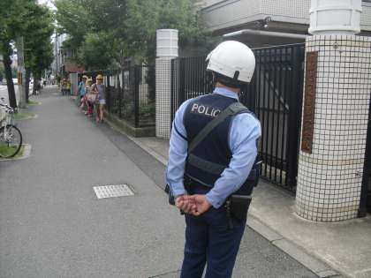 登校の見守り活動に地域・保護者の皆様には日ごろから協力いただき誠にありがとうございます。朝の見守りには,中京警察署の方にもお世話になっています。自転車に乗っている人にも,必要に応じて指導をしてくださいます。