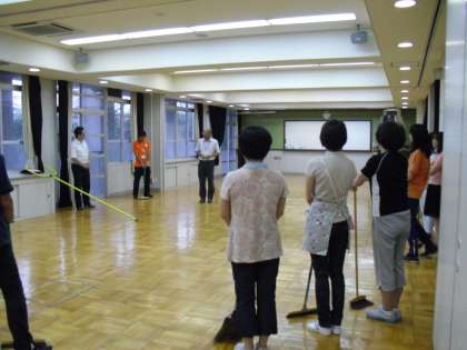 中京警察署から,講師の方に来ていただいて職員の防犯訓練を行いました。不審者が侵入した際の心構えや対処の仕方について教えていただきました。実際に,壁や床面を使って,さすまたや手近にある箒で,距離を取りながら,囲い込む方法を訓練しました。
