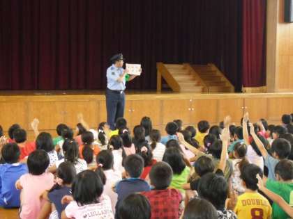 避難終了後,体育館に全員が集まって中京警察署の方の話を聞きました。自分の身を守るために「いか・の・お・す・し」が大切であることを話していただきました。その後,大声を出す訓練をしました。