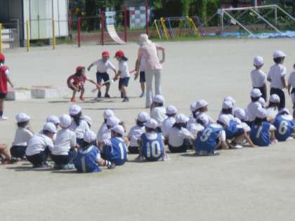 昼からは、1・2年・は組の団体競技「おみこしワッショイ!」の練習です。2年生の子どもたちがリードしながら4人一組で走ります。暑い中,頑張って練習に取り組んでいました。