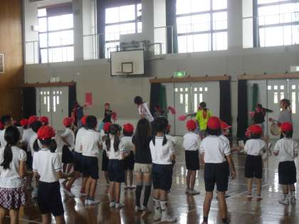 中間休み,赤白の色別に分かれて応援の練習に取り組みました。応援団のリードのもと紅組は体育館で練習しました。しっかり声も出ていました。