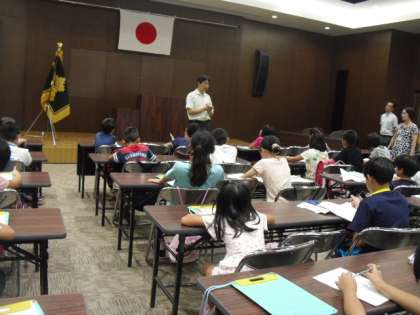 初めて見る警察官の装備、訓練中の警察官に子どもたちは目を輝かせていました。