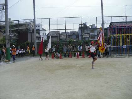 その様子をお伝えします。開会宣言,選手入場です。凛々の子どもたちが演奏する中,応援団長を先頭に選手入場です。