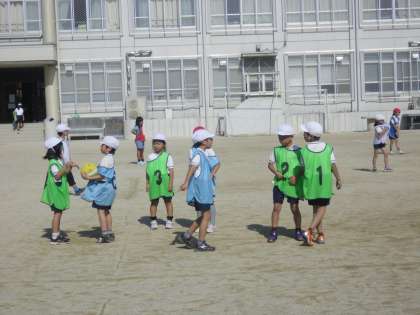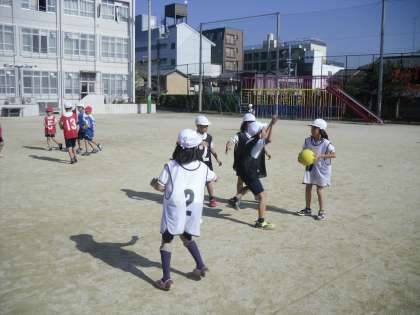 2年生は体育の時間にパスゲームをしています。3人対3人で試合をします。自分たちではじめと終わりの挨拶もします。徐々にルールに慣れて,素早く動けるようになってきました。