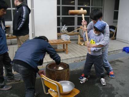 子どもたちもたくさん参加し,希望者の子どもたちは,お餅つきもさせてもらいました。「よいしょ」の掛け声のもと,力をいれてお餅をついていました。