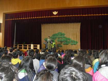 2つ目は,山本泰太郎さん,山本則孝さん,山本凜太郎さんによる「附子」の公演でした。太郎冠者と次郎冠者の軽快なテンポの会話と主人とのやり取りの面白さに引き込まれ,笑い声が響いていました。