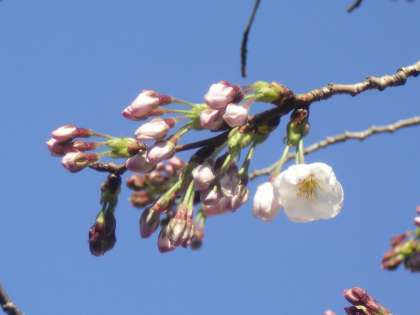 27日校門付近,運動場の桜が開花しました。薄いピンク色の花がとてもきれいです。桜の花が咲くと春本番を感じます。