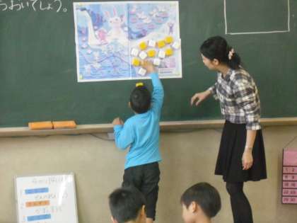 1年生は,2時間目に算数の学習を行いました。教科書に載っている生き物や植物の数を数図ブロックを使って確認をしていきます。みんな正しく数えることができていました。
