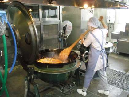今日は初めての給食です。2名の給食調理員が丁寧に心を込めて給食を作ります。大きな釜で約300名分を作っています。