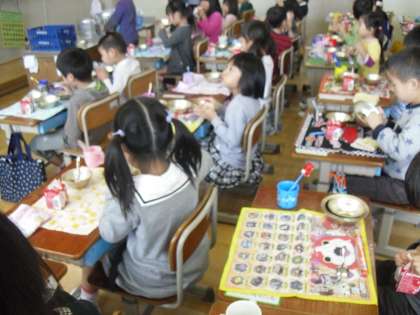 1年生も給食に慣れ,当番活動も順序良くできるようになりました。給食も時間内に残さず食べられるようになってきています。