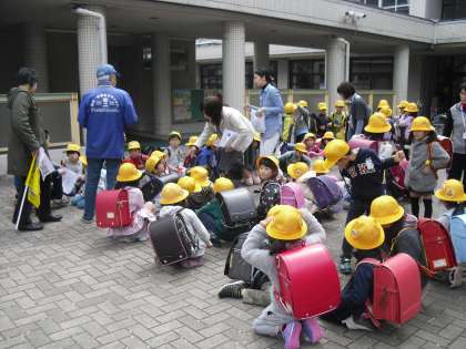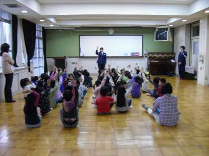 横断歩道を渡るときに気をつけなければいけないことを,中京警察署の署員の方々と一緒に考え,話し合いました。その後,雨の中を傘をさして歩きました。事前に話し合った正しい渡り方に二人ずつ挑戦しました。