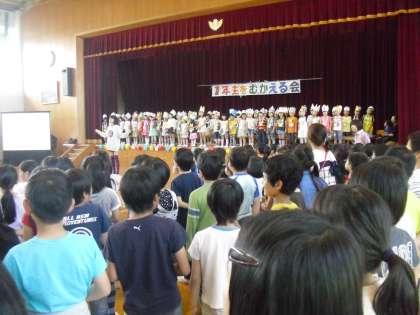 次は全員合唱です。1年生ようこそ児童会に,という気持ちを込めて,1年生もよく知っている「ゆうき100%」を歌いました。体育館中に響く声で元気に歌いました。