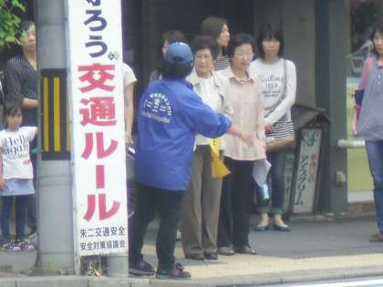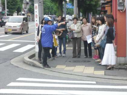 説明の後,2グループに分かれて現地に行って,実際の指導の仕方について学びました。この場所は,車の通行量が多く,右左折車も多い場所です。安全に待てる場所や安全に渡らせる方法を確認しました。