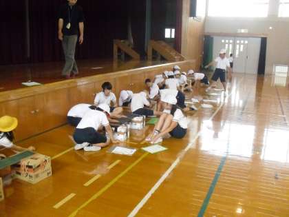 長座体前屈の様子です。体の柔軟さを測定します。膝まで頭のつく子も数多くいます。