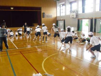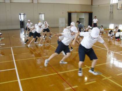 反復横とびの様子です。靴が滑らないように,ぬれた雑巾で靴をぬぐってから挑戦します。敏捷性を測定しますが,切り返しが難しかったようです。