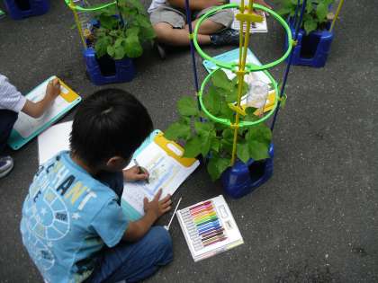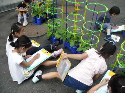 「わたしのむねぐらいの高さまで伸びているよ。」「いつ花が咲くのかな?」とあさがおの成長を感じていました。