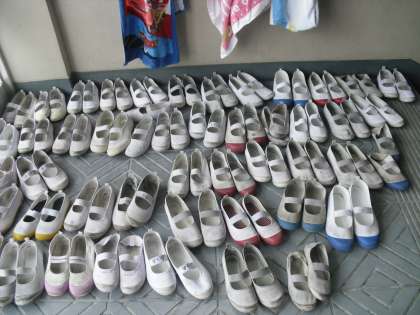 3,4年生の子どもたちが,プールに入っている時の脱いだ上靴の様子です。靴の向きをそろえ,通行する人の迷惑にならないように,見た目も美しく並べられています。