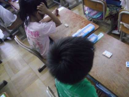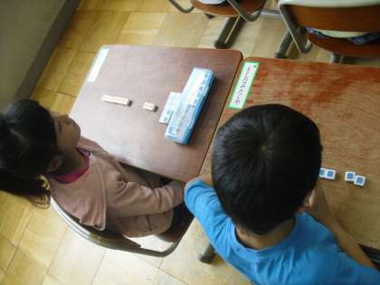 1年生は,数図ブロックを用いて引き算の学習をしていました。前で友達がするのを確認しながら,自分も一緒にブロックを動かします。