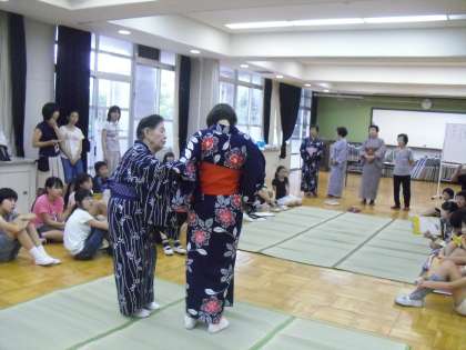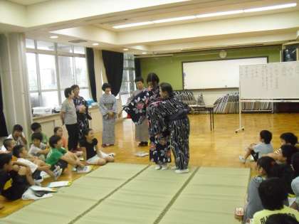 代表の児童が着た後,全員が浴衣着付け体験をしました。