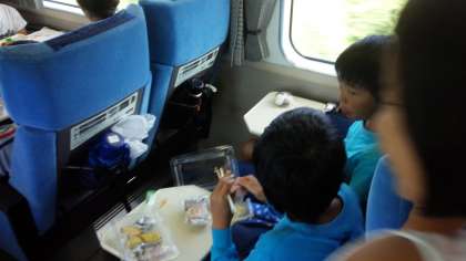 おうちの方に作っていただいたお弁当を食べる時間です!愛情のこもったお弁当をおいしく食べています。先頭車両なので,景色がしっかり見えます。夏の空が,広がっています。