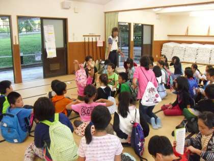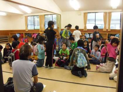 活動の指示を聞くために,90畳の部屋で話を聞きます。グループで揃ったら、教員の話が始まります。集合が早くできるようになると,時間に余裕が生まれ、活動時間がじっくりととれます。