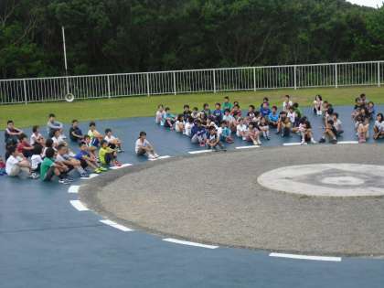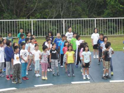 7時からは朝の集いです。朱二小学校と稲荷小学校の子どもたちが,一緒に朝の集いを行いました。校歌も大きな声で歌えました。