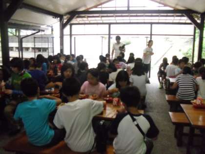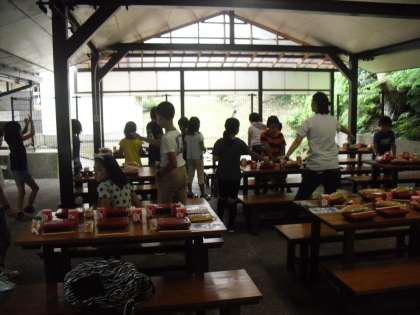 食事係の子どもたちが,グループの朝食の配膳を行います。今日は,パン,牛乳,オムレツ,ウインナーソーセージなどです。ほとんど残さず食べることができました。