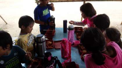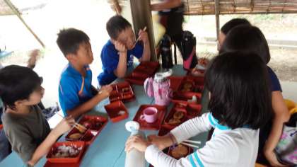 たくさん身体を動かした後はおなかがすきました。楽しみにしていた昼食です。カツやほうれん草の和え物などでした。おいしくいただきました。
