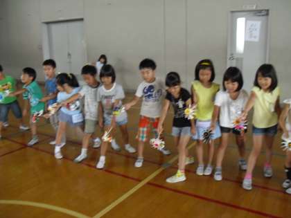みんなで走って風をつくり,くるくる風車をまわしていました。