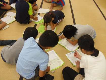 健康観察と生活チェックを班で行います。みんな元気で,特に調子の悪い子どもはいません。