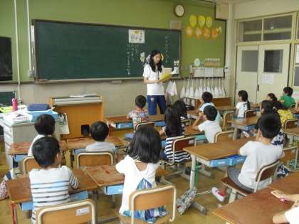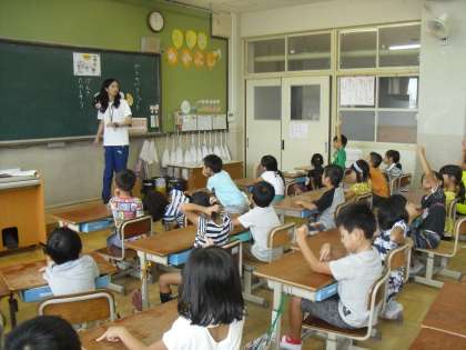 1年い組は,道徳の学習でした。お話を聞いて,主人公が,どのような思いやきもちをもっていたのかを考えます。グー,チョキ,パーの手の合図で,前の人と意見が同じか,違うか,似ているかの意思を表すことにも挑戦していました。