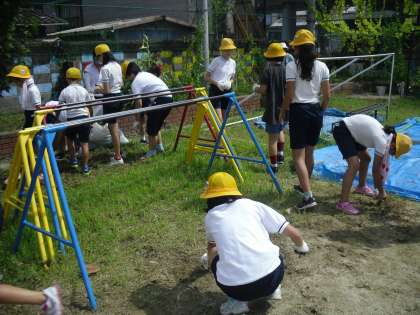 25分間,全校の児童が頑張って草抜きをすると,最後にはきれいになりました。運動会に向けて,さっぱりとした運動場になりました。