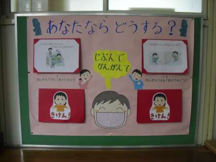 そこで,保健室前の掲示板には,起こりそうな事故やケガについて絵で示し,どうしたらこのようなケガを防ぐことができるのか,自分で考えられるような掲示物を作りました。それ合わせ1,2年生には身体計測前の保健指導で同じ絵を使って指導しました。
