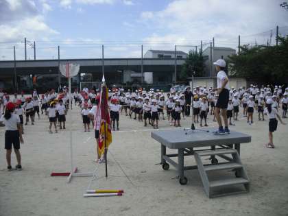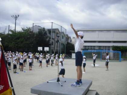 最後に,準備運動です。担当の児童が前に来てリードします。全校児童のほとんどの子どもがしっかりと覚えているので,動きも軽やかです。